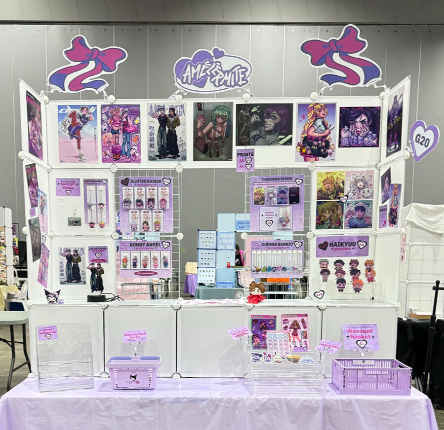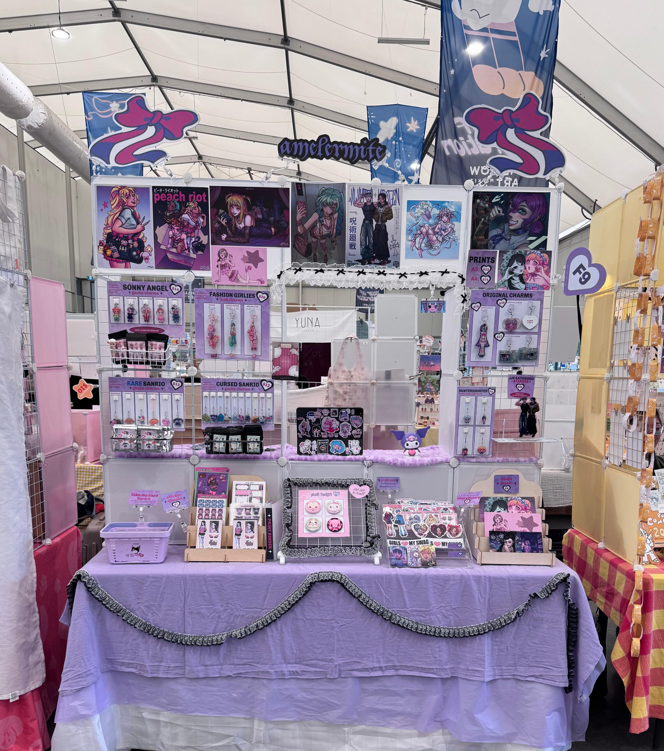 i'm ame + i have been tabling as amelermite for 2 years for over a dozen events across australiaᯓ★i always loved shopping at the artist alley + started my tabling journey at a small university artist alley with @messy.beee with hopes of paying off my trinket debt...my personal art brand is all about girlhood where i express my love for pretty girls + fashion with fandom 𖹭 i hope that my art can be an accessory that can embolden someone's sense of self!