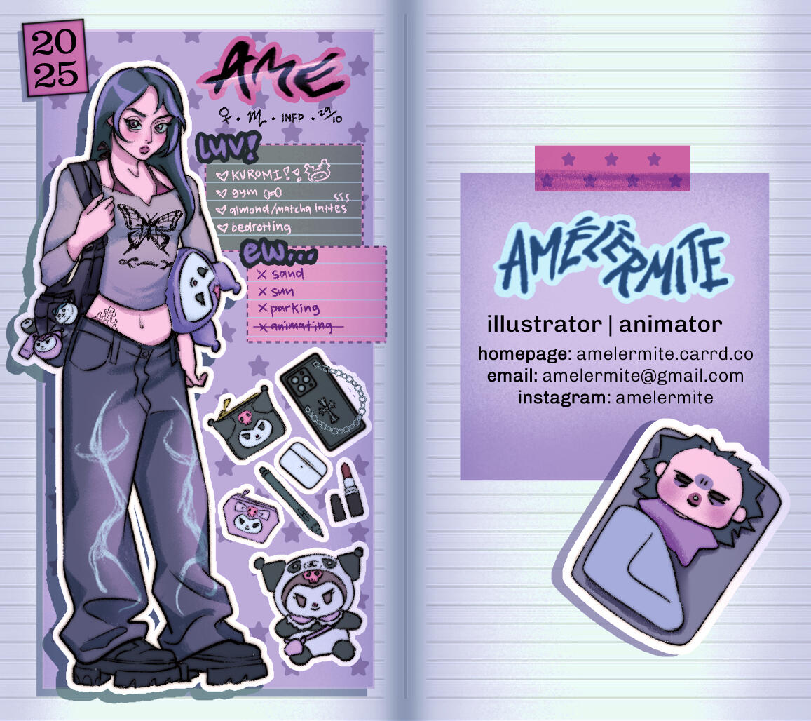 i'm ame (she/her), a melbourne/naarm-based 2D animator, illustrator & kuromi enthusiast. i graduated from RMIT's animation degree in 2025 and run a small biz under the brand name amelermite selling art at artist alleys across australia.through my art, i express my love for pretty girls + y2k fashion/culture inspired by early 2000s anime and japanese teen fashion magazines (egg, popteen + ageha)contact me at amelermite.gmail.com for any inquiries